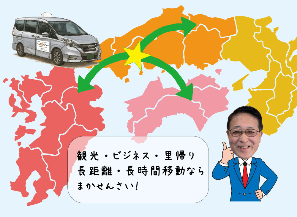 長距離ドライバー経験を活かし、 県外への運行も大歓迎!あなたの旅を全力でサポート。キャリーケースやゴルフバックなど余裕で積めます。
